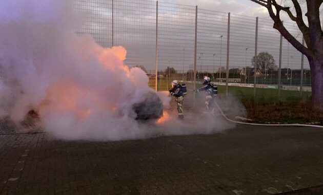 Nähe des Sportplatzes in Bocholt Ortsteil Suderwick, stand ein PKW in Vollbrand. Auf der Anfahrt war eine starke Rauchentwicklung zu sehen.