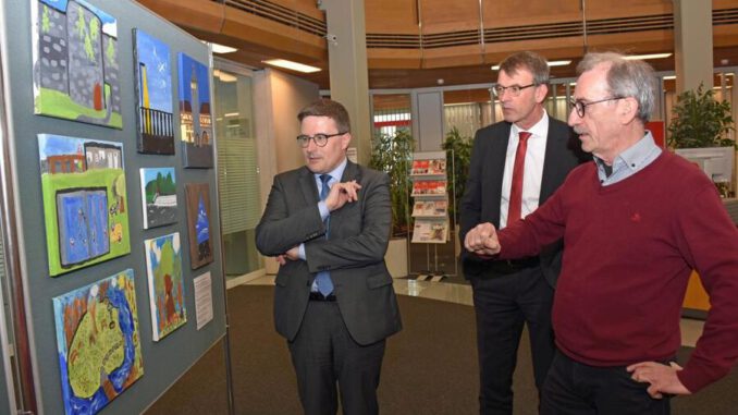 Nach dem Abschluss des großen Malwettbewerbs zum 50-jährigen Bestehen des Main-Tauber-Kreises sind nun alle 62 eingereichten Bilder bei einer Ausstellung in der Filiale der Sparkasse Tauberfranken in der Hauptstraße in Tauberbischofsheim zu sehen. Die dreiköpfige Wettbewerbsjury – bestehend aus Landrat Christoph Schauder, Sparkassenchef Peter Vogel und dem Künstler Gunter Schmidt – überzeugte sich jetzt von der gelungenen Präsentation der Werke.