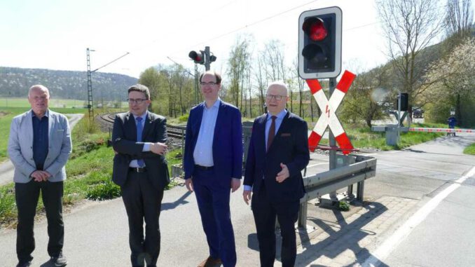 Auch aktuelle Problemstellen wurden besichtigt. Hauptthema war die Beseitigung des unzeitgemäßen Doppelbahnübergangs in Königshofen. Es besteht Einigkeit zwischen PStS Michael Theurer, Landrat Christoph Schauder und der Stadt Lauda-Königshofen, dass die Schließzeiten der Schranken und die Langsamfahrstelle auf der Schiene weder dem Straßen- noch dem Zugverkehr zuzumuten sind.