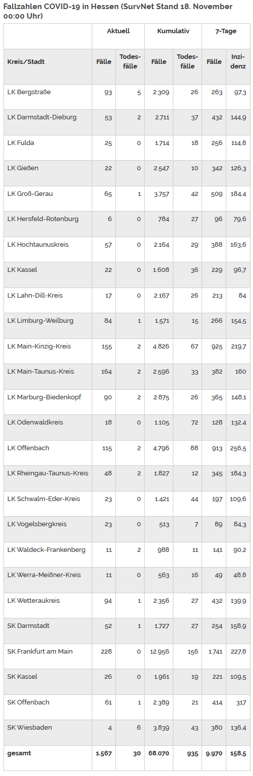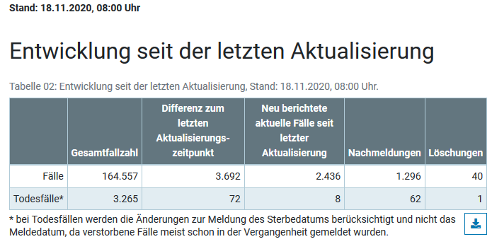 Am Mittwoch, 18. November 2020, hat das Landesgesundheitsamt (LGA) Baden-Württemberg insgesamt weitere 3.062 bestätigte Infektionen mit dem Coronavirus gemeldet (Stand: 16.00 Uhr, siehe Tabelle im Tagesbericht COVID-19 (PDF)). Damit steigt die Zahl der seit Beginn der Pandemie Infizierten in Baden-Württemberg auf mindestens 123.923 an. Davon sind ungefähr 78.185 (+1.939) Personen bereits wieder von ihrer Covid-19-Erkrankung genesen. Derzeit sind geschätzt 43.370 (+1.087) Menschen im Land mit dem Coronavirus (SARS-CoV-2) infiziert.