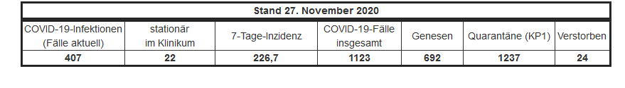 Die Fallzahlen im Neckar-Odenwald-Kreis vom 29. November 2020. Die 7-Tages-Inzidenz liegt bei 126,8