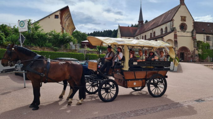 Mit einem schweren Warmblut-Gespann geht es um 10 Uhr auf den Satzenberg, durch die Weinlage „First“ bis zum Schafhof, mit weiten Ausblicken über die ehemalige Klostergemarkung. Nach einem Glas Klosterwein führt die Tour durch den Schneiderhain, vorbei an der Wolfsgrube, zurück zur Klostermühle.