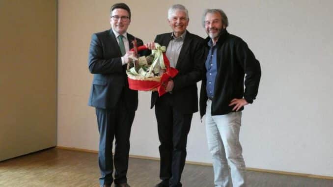 Landrat Christoph Schauder und Geschäftsführer Lorenz Flad verabschiedeten zudem Landwirtschaftsdirektor a.D. Meinhard Stärkel und überreichten ihm für seine langjährige Arbeit als Vorstandsmitglied und Ansprechpartner des KLPV einen Präsentkorb mit regionalen Produkten aus der Bio-Musterregion Main-Tauber-Kreis.
