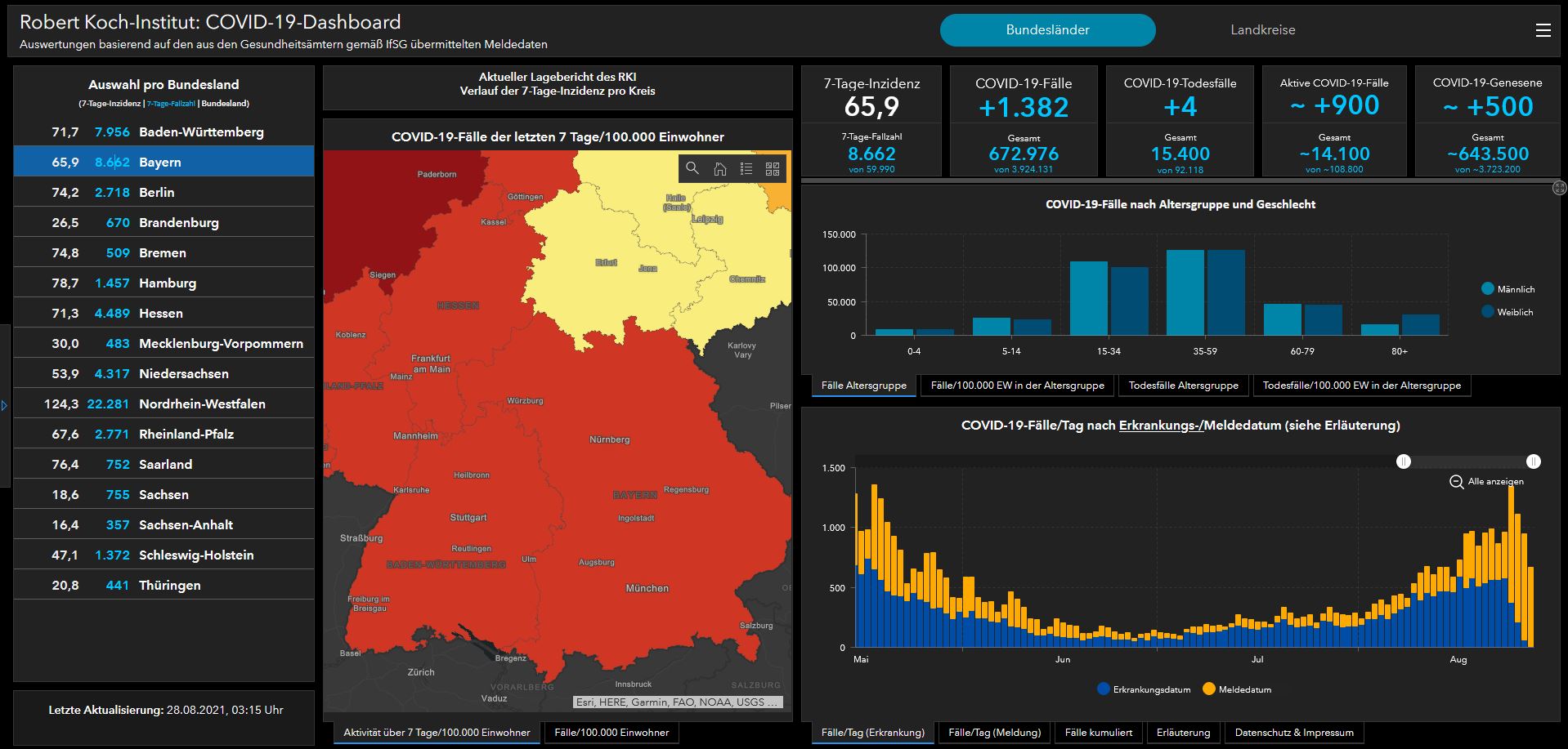 Also wenn man nun die letzten 4 Monate ( Mai/21 – August/21) vergleicht, ist der Unterschied zwischen Bayern und Baden-Württemberg, bezüglich der Corona Fallzahlen Statistik, laut RKI (siehe Grafiken / Grafikkurve) so gut wie 0 ( Null).