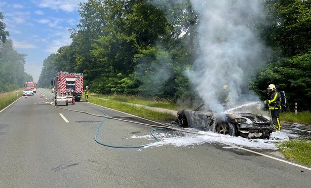 FW Alpen: Brennender Sportwagen im Waldgebiet „Die Leucht“