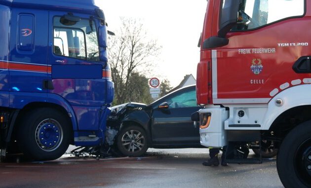 Um 10:33 Uhr wurde die Feuerwehr Celle zu einem Verkehrsunfall mit eingeklemmter Person auf der Kreuzung Lüneburger Heerstraße und Lachtehäuser Straße alarmiert. Ein PKW war frontal mit einem LKW zusammengestoßen. Bei Eintreffen der Feuerwehr war keine Person mehr im betroffenen PKW eingeklemmt. Durch die Einsatzkräfte der Feuerwehr wurden Sicherungsmaßnahmen durchgeführt und auslaufende Betriebsstoffe gebunden. Verletzte Personen wurden durch den Rettungsdienst versorgt.