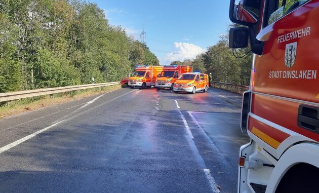 Heute Nachmittag um 14:20 Uhr wurden die Einheiten der Feuerwehr Dinslaken zu einem Verkehrsunfall auf der Brinkstraße (B8) alarmiert. An der Einsatzstelle waren ein PKW und ein Kleintransporter mit je zwei Insassen frontal zusammen gestoßen. Die Beifahrerin des PKW musste durch die Feuerwehr mit hydraulischem Rettungsgerät befreit werden. Drei der beteiligten Personen wurden zur weiteren Behandlung in ein Krankenhaus gebracht. Während des Einsatzes wurde der Brandschutz sichergestellt, die Fahrzeuge wurden stromlos geschaltet und auslaufende Betriebsmittel wurden aufgenommen. Bis ca. 17 Uhr war die Brinkstraße für den Verkehr gesperrt. An dem Einsatz beteiligt waren die Feuerwehr Dinslaken, der Rettungsdienst Dinslaken, der Ret-tungsdienst Oberhausen, das DRK Dinslaken und die Polizei Dinslaken.