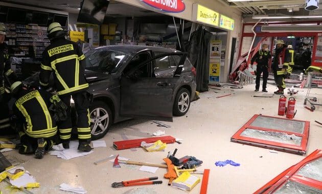Ein PKW war, vermutlich aufgrund eines medizinischen Notfalls des Fahrers, von der Schüruferstraße geradeaus in den Eingang eines Supermarktes gefahren und im Bereich der Postfiliale zum Stehen gekommen. Wie durch ein Wunder wurden in dem immer noch gut besuchten Supermarkt keine weiteren Personen verletzt. Die Polizei hat die Ermittlungen zur genauen Unfallursache aufgenommen.