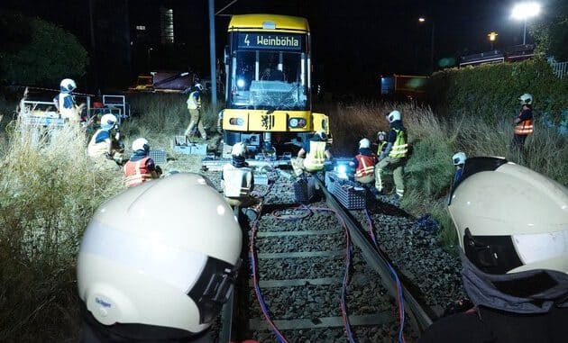 16 Kolleginnen und Kollegen der Feuer- und Rettungswache Albertstadt wurden gemeinsam mit den Kameradinnen und Kameraden der Freiwilligen Feuerwehr Coswig zu einem Verkehrsunfall mit Straßenbahnbeteiligung alarmiert. Aus noch zu ermittelnder Ursache war auf einem Bahnübergang ein PKW Mazda mit einer Straßenbahn kollidiert. Der PKW kam etwa 15 Meter nach dem Zusammenstoß zum Stehen. Die Straßenbahn war etwa 40 Meter nach dem Bahnübergang zum Stehen gekommen. Das erste Drehgestell war von den Gleisen gesprungen und im Schotterbett eingesunken. Dies führte dazu, dass sich das erste Wagenteil um 50cm verschoben und das Fahrgestell sich unter dem Gleiskopf verkeilt hatte. Bei dem Unfall wurden mehrere Personen verletzt und vom Rettungsdienst versorgt. Um die Straßenbahn wieder zurück in den bahneigenen Körper zu bekommen waren mehrere Anläufe notwendig, da die Straßenbahn immer wieder zu kippen drohte. Das Fahrzeug wurde mit hydraulischen Hebern angehoben und mit einer Verschiebebrücke zurück auf die Gleise gesetzt. Da sich der Einsatz über mehrere Stunden erstreckte, wurden die Einsatzkräfte durch die Verpflegungskomponente der Stadtteilfeuerwehr Lockwitz versorgt.