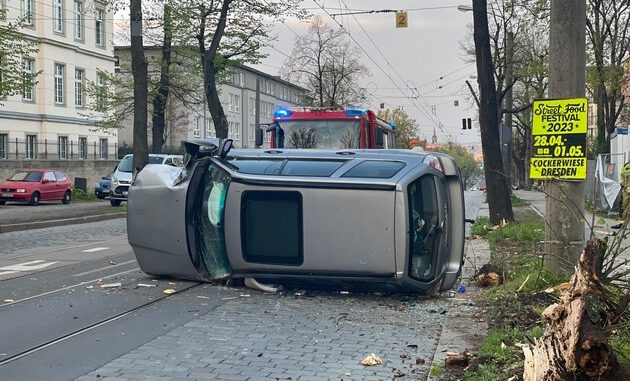 Auf dem Rückweg von der Einsatzstelle auf der Leipziger Straße kam ein Löschfahrzeug der Feuer und Rettungswache Albertstadt zu einem Verkehrsunfall hinzu. Aus noch unbekannter Ursache war der 61-jährige Fahrer eines PKW Subaru mit seinem Fahrzeug verunfallt. Dabei war der PKW auf der linken Seite zum Liegen gekommen. Der Fahrer konnte sich von selbst aus dem Fahrzeug befreien und blieb augenscheinlich unverletzt. Die Feuerwehr sicherte das Fahrzeug und die Einsatzstelle und nahm ausgelaufene Betriebsmittel auf. Die Polizei hat die Ermittlungen zur Unfallursache aufgenommen. Aufgrund der Einsatzmaßnahmen kommt es vor dem Landesfunkhaus Sachsen des MDR zu Verkehrsbehinderungen.