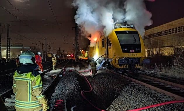 Ebenfalls über die Notfallleitstelle der Deutschen Bahn AG wurden Feuerwehr und Rettungsdienst zum Brand einer Lokomotive alarmiert. Aus noch unbekannter Ursache war ein Turmtriebwagen im mittleren Fahrzeugbereich auf einem Nebengleis in Brand geraten. Mitarbeitende hatten das Fahrzeug bereits gegen Wegrollen gesichert und erste Löschversuche unternommen. Ein Trupp unter Atemschutz nahm mit einem Strahlrohr die Brandbekämpfung auf. Nachdem der Brand gelöscht war, wurde die Brandstelle mit Löschschaum abgedeckt und der betroffene Bereich mit einer Wärmebildkamera auf eventuelle Glutnester hin überprüft. Verletzt wurde niemand. Zu diesem Einsatz wurden insgesamt 49 Einsatzkräfte der Feuer- und Rettungswachen Altstadt und Übigau, der Rettungswache Reick, der A-Dienst, der B-Dienst, der U-Dienst sowie die Stadtteilfeuerwehren Kaitz, Langebrück, Lockwitz und Niedersedlitz alarmiert.