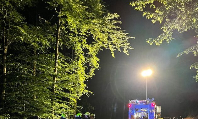In der Nacht des 18.05.2022 gegen 01:37 Uhr wurden die Einheiten Hauptamtlich und Süd sowie der Rettungsdienst mit Notarzt zu einem Verkehrsunfall auf der Paderborner Straße („Gauseköte“) gerufen. Aus bislang ungeklärter Ursache war ein PKW von der Straße abgekommen, gegen einen Baum geprallt und einige Meter weiter im Straßengraben zum Stehen gekommen. Ein Zeuge hatte das Ereignis beobachtet und den Notruf gewählt. Aufgrund der Meldung war zunächst von einer im Unfallfahrzeug eingeklemmten Person auszugehen. Noch während sich die ersten Einsatzkräfte auf der Anfahrt befanden, konnte die Leitstelle Lippe jedoch vorsichtige Entwarnung geben: Neueren Informationen zufolge, sollte sich in dem verunfallten Mercedes S-Klasse doch keine eingeklemmte Person mehr befinden. Dies bestätigte sich vor Ort entsprechend, sodass die Feuerwehr Detmold lediglich Sicherungsmaßnahmen vornahm. Neben der Verkehrsabsicherung und dem Ausleuchten der Einsatzstelle wurde die Fahrzeugbatterie abgeklemmt sowie der Brandschutz sichergestellt. Die Polizei hat die Ermittlungen zum Unfallhergang aufgenommen.