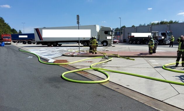 Am Donnerstagnachmittag wurden die Kräfte der Hauptfeuerwache, des Löschzuges 3, des Löschzuges 2 und der ABC Komponente auf den Rastplatz Bruchmühle gerufen. Ein LKW hatte sich ca. 2KM vor dem Rastplatz den Kraftstofftank aufgerissen. Am Rastplatz angekommen verlor der LKW weiterhin große Mengen Diesel. Diese liefen über den Parkplatz und in das angeschlossene Kanalnetz. Die Feuerwehr Gevelsberg stellte den Brandschutz sicher und fing weiter auslaufenden Diesel auf. Ebenfalls wurden die Kanaleinläufe verschlossen und der ausgelaufene Diesel mit Bindemittel abgebunden. Der aufgefangene Kraftstoff wurde durch einen Trupp in Schutzkleidung in ein Bergefass umgefüllt. Für die Dauer des Einsatzes musste der Rastplatz teilweise gesperrt werden. Eine Entsorgungsfirma wurde mit der Reinigung der Fahrbahn und des Ratsplatzes beauftragt. In Zusammenarbeit mit der unteren Wasserbehörde setzte die Feuerwehr auf dem Regenrückhaltebecken eine Öl-Sperre und spülte den gesamten Kanal bis zum Becken. Für diese Maßnahme wurde zusätzlich ein Tanklöschfahrzeug der Feuerwehr Schwelm eingesetzt. Während der Dauer des Einsatzes wurde die Wache am Haufer Bahnhof durch den Löschzug 1 besetzt. Die Feuerwehr Gevelsberg war mit 30 Einsatzkräften ca. 3Std im Einsatz.