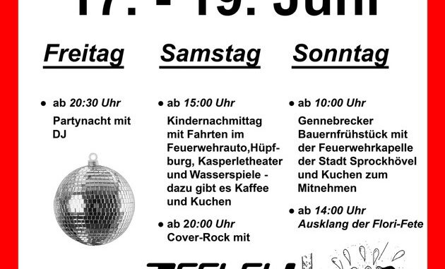 Freitag, 17.06.2022 ab 20:30 Uhr wird die Flori-Fete (https://www.flori-fete.de/) mit der Gennebrecker Club-Party in der geschmückten Fahrzeughalle eröffnet. Ein Abend mit DJ Pubbie (https://djpubbie.de).