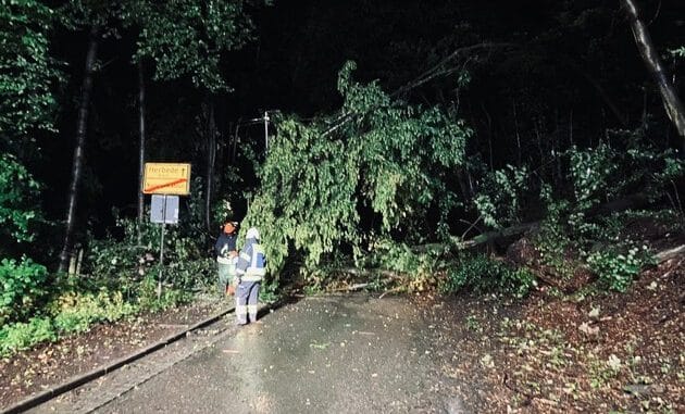 Am Sonntagabend (06.08.23) wurde die Feuerwehr Sprockhövel gegen 22 Uhr zur Straße „Zum Pleßbach“ alarmiert. Vor Ort waren drei Bäume, teilweise mit Wurzelteller, auf die Straße gestürzt. Auch eine Freileitung sowie eine Laterne wurden beschädigt. Die Feuerwehr nutzte die Seilwinde eines Löschfahrzeugs und Motorsägen, um die Bäume von der Straße zu ziehen bzw. zu zerkleinern.