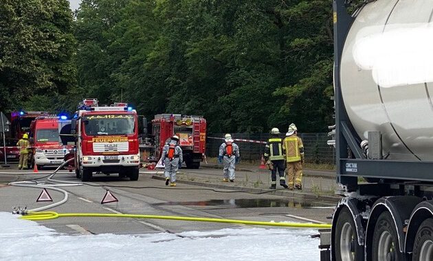 Am heutigen Freitag, 24. Juni 2022, wurde die Feuerwehr Frankenthal gegen 15:30 Uhr zu einem Einsatz in den Nordring, Kreuzung Höhe Wormser Straße gerufen. Bei einem LKW mit Tankcontainer war Flüssigkeit ausgetreten und verbreitete sich auf der Straße.
