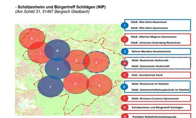 Die Notfallinformationspunkte befinden sich für Refrath in den Otto-Hahn-Schulen und ein mobiler Standort auf dem Peter-Bürling-Platz. In Bensberg wird am Albertus-Magnus-Gymnasium und an der Johannes-Gutenberg-Realschule ein Notfallinformationspunkt eingerichtet, für die Stadtmitte an der Nelson-Mandela-Gesamtschule. In Herkenrath werden die städtische Realschule und das Gymnasium genutzt, in Sand die katholische Grundschule. Für Paffrath und Hand stehen künftig das Schulzentrum im Kleefeld und das Nicolaus-Cusanus-Gymnasium zur Verfügung. Für die Schildgener Bürgerinnen und Bürger wird als Informationspunkt das Gebäude des Bürgertreffs eingerichtet.