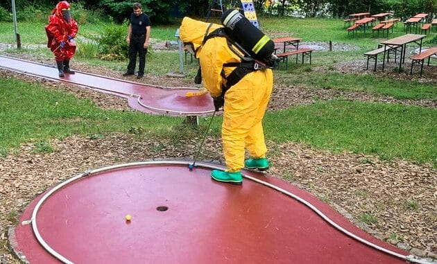 Der Sommerabschluss des Gefahrgutzuges der Feuerwehr Konstanz stand dieses Jahr unter dem Motto „Spaß und Geschicklichkeit“. Hierzu haben die Angehörigen des Zuges in Chemikalienschutzanzügen, Tychem-Anzügen und mit Pressluftatmern ausgestattet je eine Partie Minigolf sowie Pitpat absolviert.
