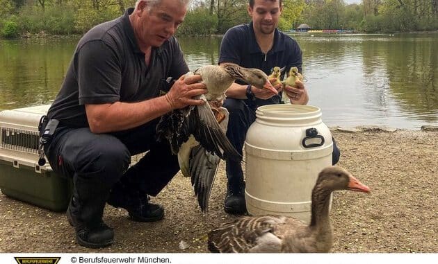 Bei dem Versuch, Schwabing zu erkunden, wurden sechs Graugänse mit ihren zehn Küken auf der Straße watschelnd gesichtet. Da dies für sie eine erhebliche Gefahr darstellte, riefen Passanten die Feuerwehr.