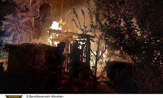 Nachbarn wurden durch lautes Knistern geweckt. Beim Blick aus dem Fenster sahen sie, die in Vollbrand stehende Gartenhütte und riefen die Feuerwehr.