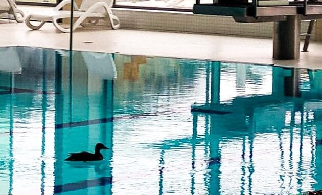 Bei einem Routinerundgang bemerkten Mitarbeiter*innen eine Ente im Schwimmbecken. Sie versuchten die Ente aus dem Becken nach draußen zu treiben. Nach mehrmaligen Fehlversuchen riefen sie die Feuerwehr.