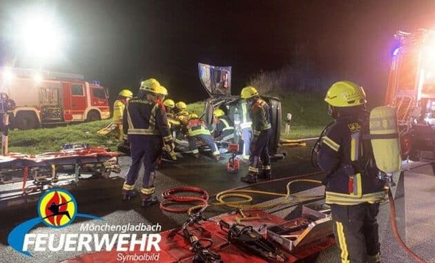 In der Nacht zum Samstag ereignete sich aus bislang ungeklärter Ursache auf der BAB A61 in Fahrtrichtung Koblenz kurz vor der Ausfahrt Nordpark ein Verkehrsunfall mit insgesamt 4 verletzten Personen, darunter ein Kind. Der allein verunfallte Pkw kam nach einem Überschlag erst in der angrenzenden Böschung der Autobahn zum Stillstand. Alle Verletzten wurden noch an der Unfallstelle von einem Notarzt und den Besatzungen von insgesamt vier Rettungswagen notfallmedizinisch behandelt. Aufgrund der anzunehmenden Schwere der Verletzungen wurden die 4 Verletzten in Notfallkrankenhäuser in Mönchengladbach transportiert. Die Einsatzkräfte der Feuerwehr sicherten die Unfallstelle mit Verkehrssicherungsgeräten ab und stellten vorsorglich Löschmittel bereit. Mit einem Lichtmast wurde die Unfallstelle ausgeleuchtet. Für die Zeitdauer der Rettungsmaßnahmen wurde die A 61 in Fahrtrichtung Koblenz halbseitig durch die Polizei gesperrt.