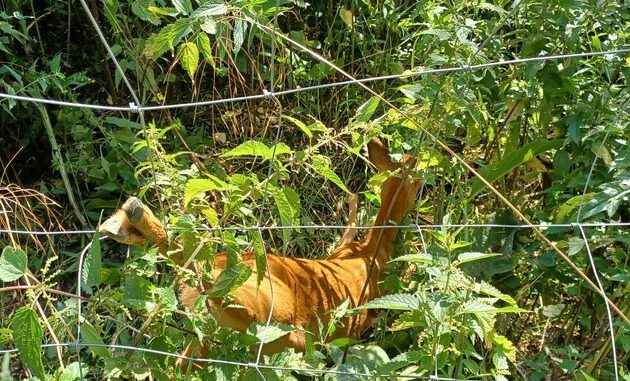 Eine aufmerksame Hundebesitzerin bemerkte mit ihren Tieren das hilflose Wildtier. Im hohen Gras hatte sich das Tier mit dem rechten Hinterlauf in einem Drahtzaun verfangen.