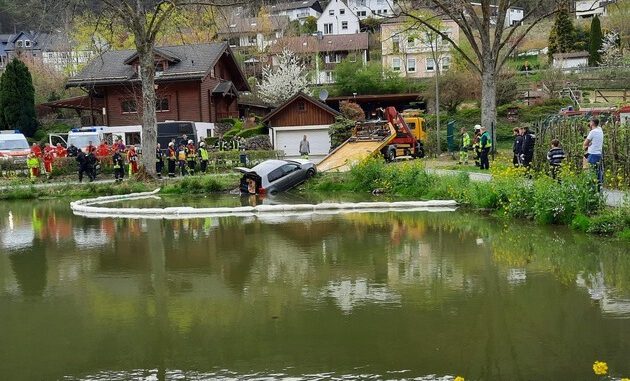 FW-OE: PKW in Weiher – Feuerwehr und DLRG unterstützen bei der Bergung