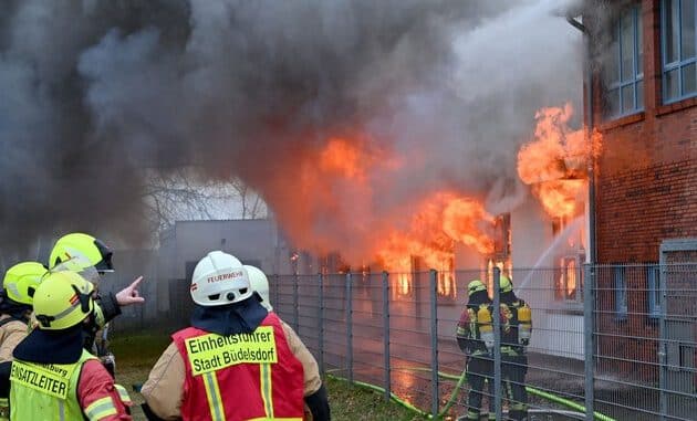 Am Donnerstag 23.02.2023 wurde die Feuerwehr zu einem Dachstuhlbrand in einer Tischlerei in der Kollunder Straße in Rendsburg gerufen. Zufällig in der Nähe beim Einkauf in einem Großhandel für Feuerwehrzubehör befindliche Feuerwehrmänner konnten der Leitstelle die Ausmaße des Feuers durchgeben und melden, daß keine Menschen mehr im Gebäude sind. Schnell wurde daraufhin die Alarmstufe von FEU G auf FEU 2 erhöht. Rund 85 Feuerwehrleute der Wehren aus Rendsburg, Schacht-Audorf und Büdelsdorf bekämpften den Brand in der rund 8×20 Meter großen Werkhalle und konnten ein Übergreifen der Flammen auf das Verwaltungsgebäude des Betriebes verhindern. Die Brandbekämpfung wurde durch das Dach aus Blechplatten erschwert, diese mussen zum Teil aufgesägt werden. Über Warnapps wurden Anwohner aufgefordert, angesichts der Rauchentwicklung Fenster und Türen geschlossen zu halten. Zur Brandursache und der Höhe des Schadens gibt es noch keine gesicherten Erkenntnisse. Menschen kamen bei dem Feuer nicht zu Schaden.