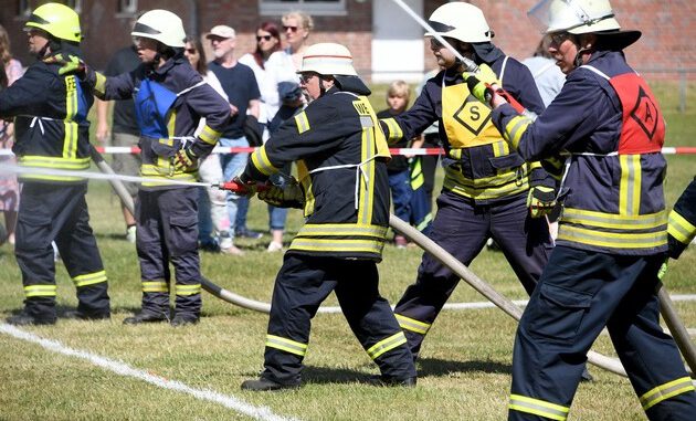 Wasbek – Sonne und Verantwortliche strahlten um die Wette : „So wollen wir es haben“ (Amtswehrführer Detlev Schümann), „Endlich wieder“ (stellv.Kreiswehrführer Dirk Hagenah) und „Einfach nur schön“, (stellv.Amtswehrführer Björn Kähler) waren bester Dinge, als am Samstag (03.06.2023) die Aktiven der Freiwilligen Feuerwehren aus dem Amt Mittelholstein, Bereich Aukrug, auf dem Sportplatz in Wasbek antraten.