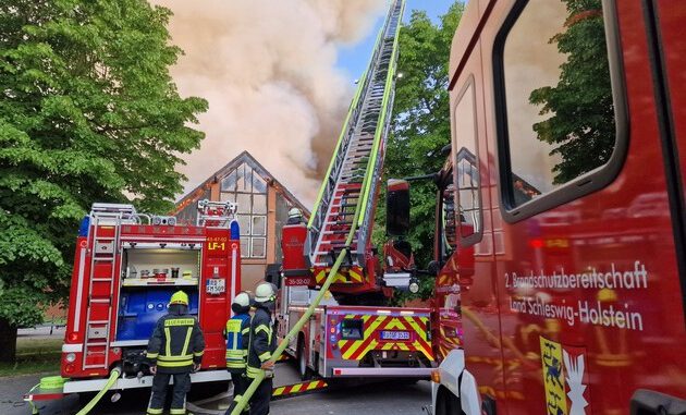 Schierensee (Kreis Rendsburg-Eckernförde) – Am Sonntagabend gegen 20:00 Uhr ist aus bisher unbekannter Ursache ein Feuer in einer ca. 30×120 Meter großen Scheune ausgebrochen. Mehrere Wehren des Amtes Eidertal sowie die Feuerwehr Bordesholm, Außerdem ist der Löschzug-Gefahrgut sowie die Technische Einsatzleitung des Kreises Rendsburg-Eckernförde im Einsatz. Ein Mitarbeiter wurde mit verbrennungen an der Hand und im Nacken bereich in eine Klinik gebracht. Die fünf Pferde konnten von der Feuerwehr gerettet werden. Die Wasserversorgung musste über mehrere Hundert Meter verlegt. Derzeit sind rund 220 Einsatzkräfte im Einsatz. Aktuell (22:30 Uhr) ist das Feuer unter Kontrolle, die Einsatzdauer ist noch nicht absehbar. Die Kripo ist an der Einsatzstelle und nimmt die ersten Ermittlungen auf.