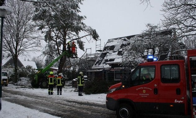 Jeersdorf. Am heutigen Freitag wurde die Feuerwehr Jeersdorf mit dem Einsatzstichwort technische Hilfeleistung alarmiert. In der Straße Eichenallee in jeersdorf, drohten mehrere Äste auf ein frisch eingedecktes Haus mit einer Photovoltaikanlage zu stürzen. Mit einem Teleskopstapler wurden die Äste in kleine Etappen abgesägt, sodass die Gefahr eines herabstürzen der Äste auf die PV-Anlage minimiert wurde. Zugute kam den Einsatzkräften das noch ein Baugerüst an der Einsatzstelle stand, von dem aus einige Äste die schon auf dem Dach lagen zersägt werden konnten. Da durch die schwere Schneelast noch weitere Äste eine Gefahr darstellte, wurden noch weitere Äste mit einem Teleskopstabler, der von einem Ortsansässigen Landwirt zur Verfügung gestellt wurde, entfernt. Da Baumateriealien den Zufahrtsweg des Teleskpstapler behinderte wurde mittels eines Gabelstaplers eine Zufahrt geschaffen. Nach gut eineinhalb Stunden konnte die Einsatzstelle an den Eigentümer übergeben werden. Die Einsatzkräfte aus Jeersdorf machten sich auf den Weg zum Feuerwehrhaus, wo dann die Kettensägen und das Einsatzfahrzeug für den nächsten Einsatz wieder hergerichtet wurden.