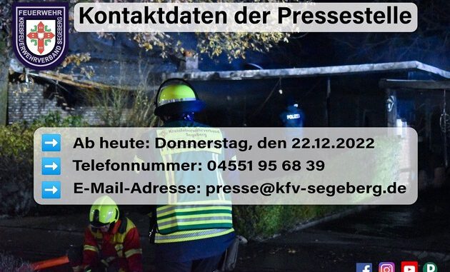 mit Wirkung vom 22.12.2022 haben sich die E-Mail-Adressen der Pressestelle des Kreisfeuerwehrverband Segeberg geändert.