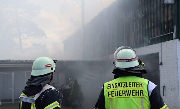 Im Rahmen der Erkundung stellte der Einsatzleiter fest, dass ein Wohnhaus an das Stallgebäude angrenzte. Im Obergeschoss des Stallgebäudes lagerten noch Stroh- und Heureste.