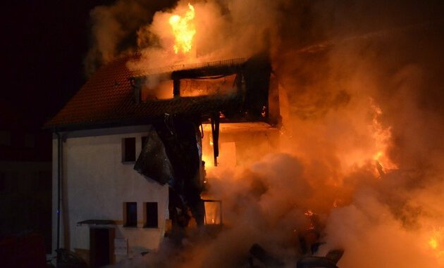 Bei Eintreffen der Feuerwehr war eine Hälfte eines Doppelhauses komplett zusammengebrochen, die Trümmer standen in Brand. Die zweite Gebäudehälfte war teilweise eingestürzt und stand ebenfalls in Brand. Anfangs war es Atemschutztrupps der Feuerwehr noch möglich das teileingestürzte Gebäude rudimentär auf Personen abzusuchen. Spätere Aussagen von Bewohnern bestätigten, dass keine Personen mehr in dieser Gebäudehälfte waren.