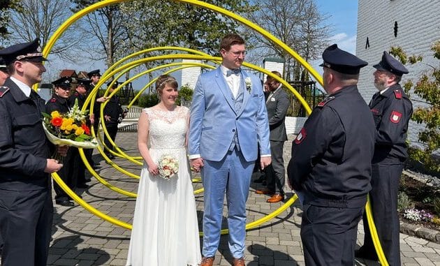 Bei schönstem Sonnenschein gingen der Tönisvorster Feuerwehrmann Jonas Backes und seine Freundin Kristina Bimmler am gestrigen Samstag den Bund der Ehe ein. Während die standesamtlichen Hochzeit im Vorster Haus Neersdonk vollzogen wurde, bereiteten die Freunde, die Familie und natürlich die Kameraden des Löschzuges Vorst dem Brautpaar einen ordentlichen Empfang vor der Türe. Nach einem kleinen Hindernisparcour gratulierten die Kameraden den Frischvermählten und wünschten alles Gute für die gemeinsame Zukunft. Das die Kameraden bei solch einem Ereignis gdabei sein wollen ist Ehrensache, schließlich ist der angehende Notfallsanitäter bereits seit rund 16 Jahren ehrenamtlich in der Tönisvorster Feuerwehr tätig.