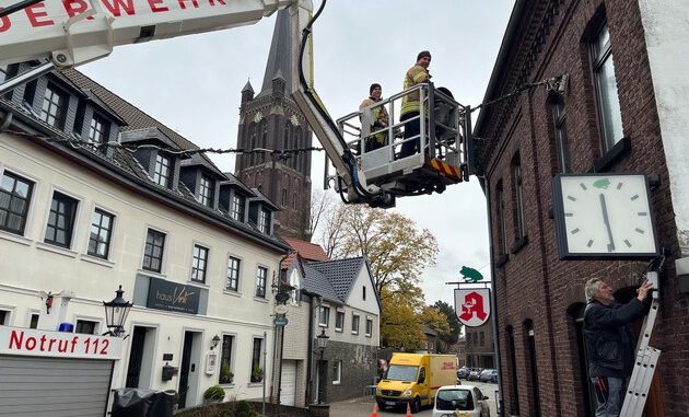 Schon fast traditionell, denn bereits seit vielen Jahren, unterstützen die Mitglieder der Freiwilligen Feuerwehr Tönisvorst die Kolpingsfamilie beim Aufhängen der Weihnachtsbeleuchtung im Vorster Ortskern. Dazu werden mit dem Hubrettungsfahrzeug die Montagepunkte der Lichterketten angefahren und diese unter den akribischen Augen der Verantwortlichen der Kolpingsfamilie, Friedhelm Oestrich und Manfred Bräuning, montiert. Anschließend werden noch verschönernde Ornamente eingehängt und die LED-Lichter abschließend getestet.
