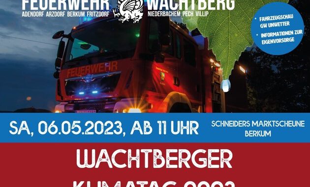 Wie wir darauf vorbereitet sind und was ihr im Rahmen der Eigenvorsorge tun könnt, zeigen wir am 1. Wachtberger Klimatag am 06.05.2023 ab 11 Uhr an der Marktscheune von Obsthof Schneider in Wachtberg-Berkum. Mitbringen werden wir unseren GW Unwetter – unser Allrounder gerade bei Starkregenereignissen.