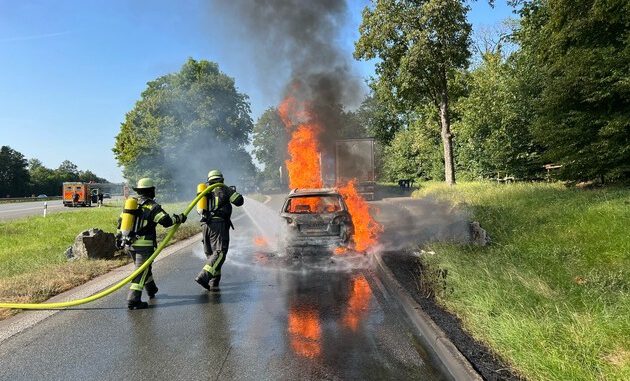 Am Samstagabend wurde der Löschzug Stadtmitte um 17:07 Uhr mit dem Alarmstichwort „FEUER_1 – brennt PKW“ auf den Parkplatz Hasenkämpe auf die Bundesautobahn 1 in Fahrtrichtung Bremen alarmiert.