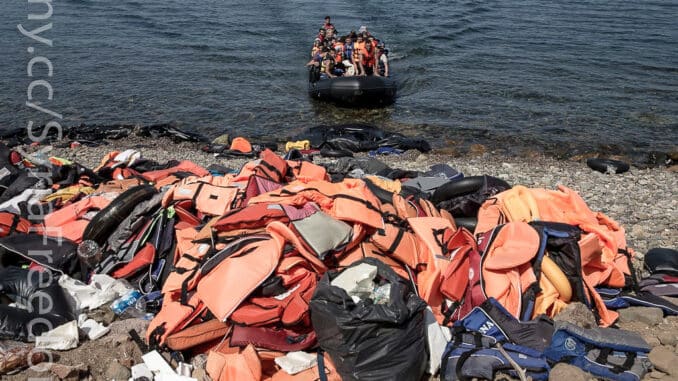 Migrants and refugees arrive by dinghy behind a huge pile of life vests after crossing from Turkey. Quelle: Openverse.org