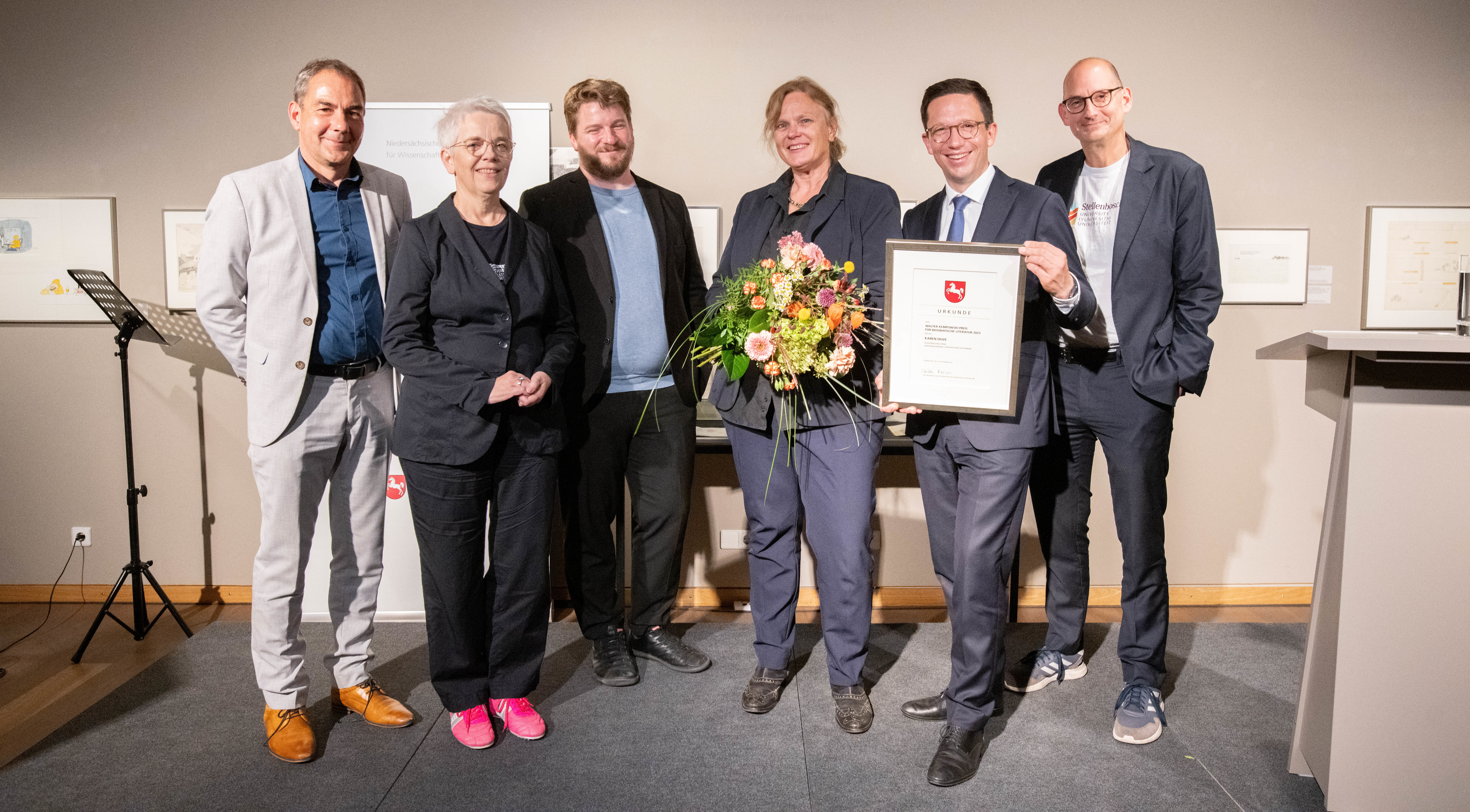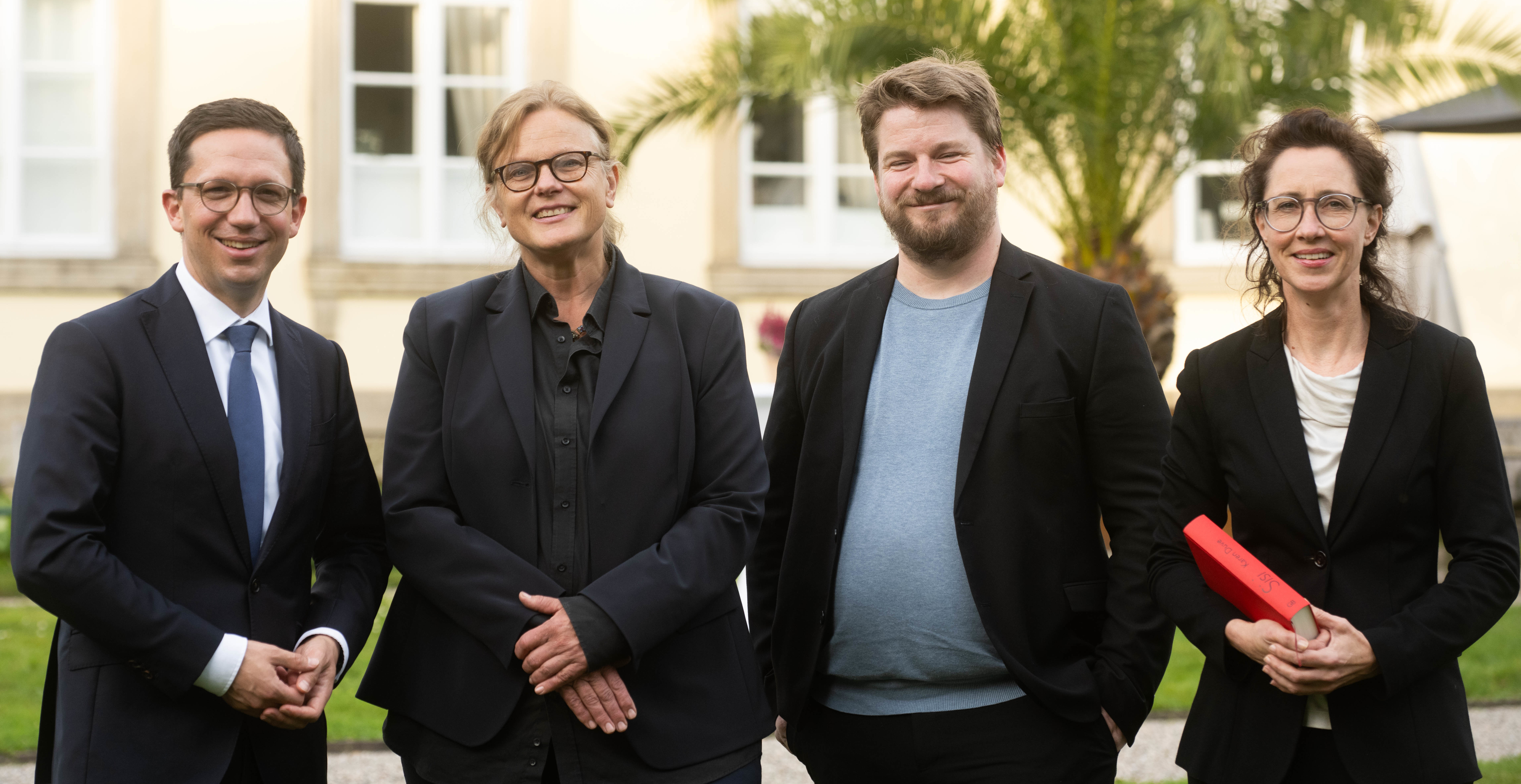 Ausgezeichnet mit dem Walter Kempowski Preis für biografische Literatur im September 2023: Schriftstellerin Karen Duve (2.v.l.) mit Kulturminister Falko Mohrs, Laudator Alexander Solloch und Eva Jandl-Jörg.