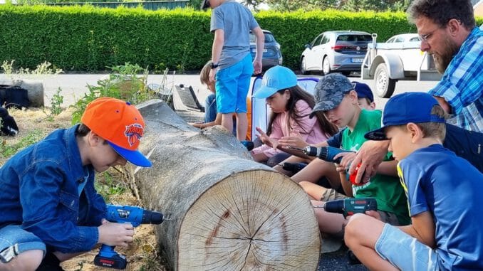 Und so machten sich jetzt die Drittklässlerinnen und Drittklässler an die Arbeit. Während eine Gruppe mit ihren von zu Hause mitgebrachten Akkuschraubern Löcher und Gänge in die Buchenstämme bohrten und damit die „Zimmer“ im Insektenhotel „einrichtete“, bemalte die andere Schildchen mit bunten Bildern und eines mit der Aufschrift „Insektenhotel“. Ein Schüler drückte aus, was wahrscheinlich alle dachten: „Das ist auf jeden Fall besser, als Mathe im Klassenzimmer.“
