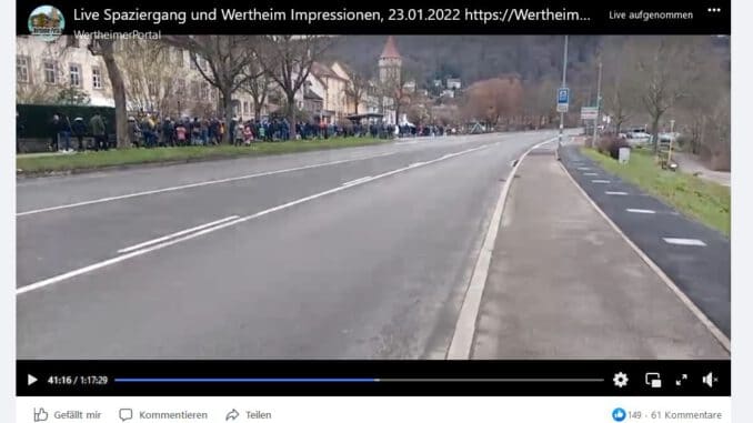auch heute, Sonntag Nachmittag gab es einen Demonstrativen Spaziergang gegen Impfpflicht und Corona-Maßnahmen . Ich war für euch Live mit der Cam unterwegs und habe einige Impressionen eingefangen. Das Video war auf Facebook.com/WertheimerPortal (Partner-Seite) Live zu sehen. Ihr könnte es dort oder direkt hier anschauen.