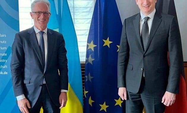 Der Minister für regionale Entwicklung der Ukraine Oleksij Tschernyschow, der von Präsident Selenskyj nach Deutschland entsandt wurde, um über die Mitgliedschaft seines Landes in der EU zu besprechen, erörterte mit dem Staatssekretär im Ministerium für Wirtschaft und Klimaschutz, Udo Philipp, die Möglichkeiten deutscher Unternehmensstandorte in ukrainischen Industrieparks.