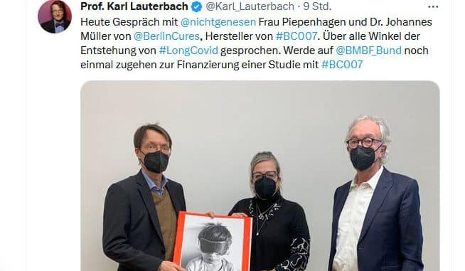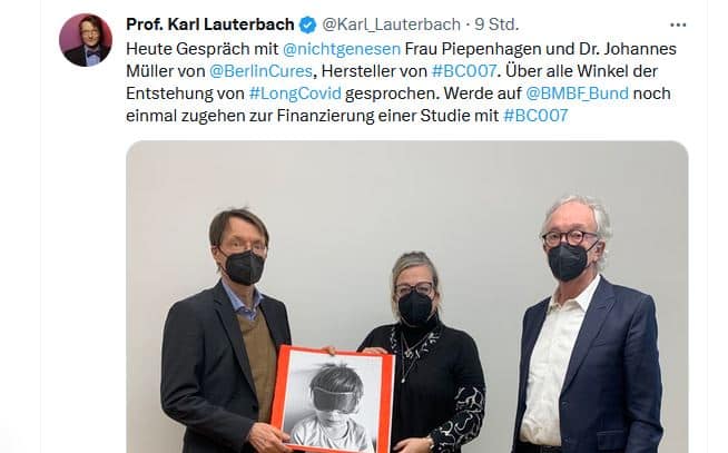 Heute Gespräch mit @nichtgenesen Frau Piepenhagen und Dr. Johannes Müller von @BerlinCures, Hersteller von #BC007. Über alle Winkel der Entstehung von #LongCovid gesprochen. Werde auf @BMBF_Bund noch einmal zugehen zur Finanzierung einer Studie mit #BC007 pic.twitter.com/SorjNjdAYi