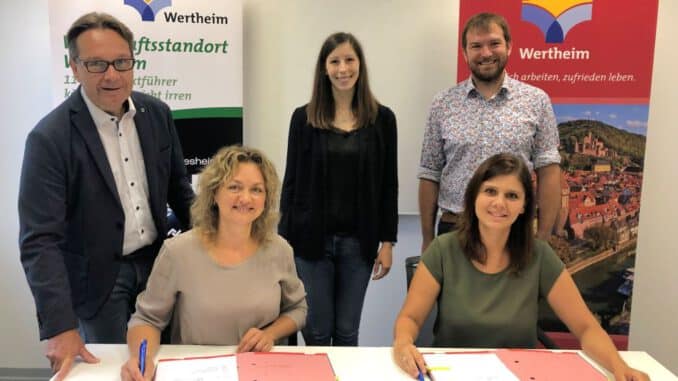 Der Vertrag für die Einrichtung eines Dorfladens in Reicholzheim ist unterzeichnet. Melissa Mayer (sitzend rechts) wird ihn leiten. Foto: Stadt Wertheim