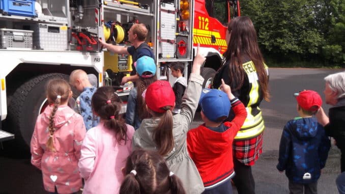 Das neue Fahrzeug „TLF 4000“ begeisterte die orangene Gruppe des Kinderhauses Reinhardshof. Foto: Kinderhaus Reinhardshof