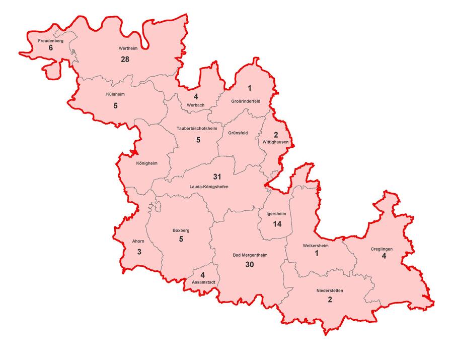 Die Zahl der Genesenen steigt um acht Personen auf 5230. Somit sind derzeit 145 Personen im Landkreis aktiv von einer nachgewiesenen Infektion betroffen. Sie verteilen sich auf das Gebiet der Kommunen Ahorn: 3, Assamstadt: 4, Bad Mergentheim: 30, Boxberg: 5, Creglingen: 4, Freudenberg: 6 (+2), Großrinderfeld: 1, Grünsfeld: 0, Igersheim: 14, Königheim: 0, Külsheim: 5, Lauda-Königshofen: 31 (+1), Niederstetten: 2, Tauberbischofsheim: 5, Weikersheim: 1, Werbach: 4 (+1), Wertheim: 28 (+1) und Wittighausen: 2.