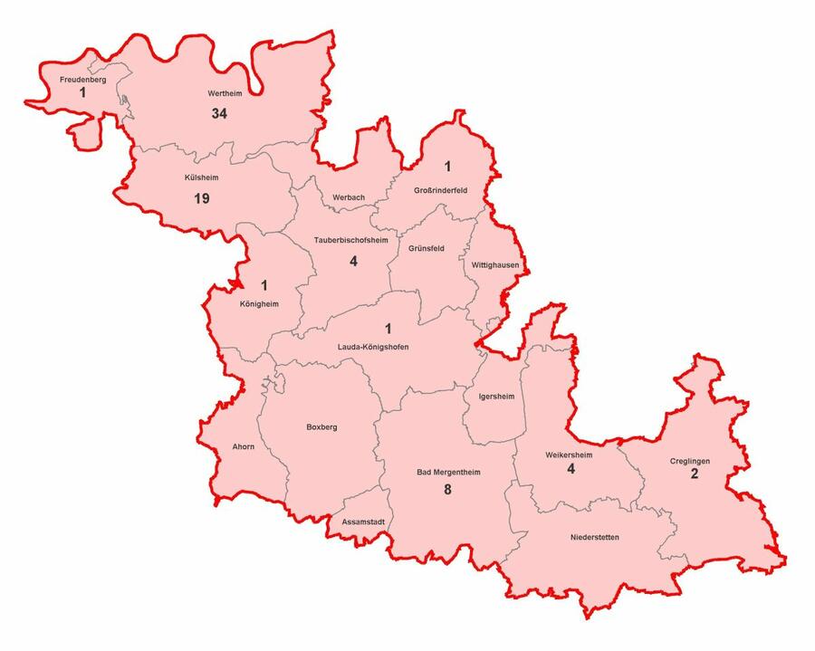Die Zahl der Genesenen bleibt bei 5074. Somit sind derzeit 75 Personen im Landkreis aktiv von einer nachgewiesenen Infektion betroffen. Diese Fälle verteilen sich auf das Gebiet der Kommunen Ahorn: 0, Assamstadt: 0, Bad Mergentheim: 8, Boxberg: 0, Creglingen: 2, Freudenberg: 1 (+1), Großrinderfeld: 1, Grünsfeld: 0, Igersheim: 0, Königheim: 1 (+1), Külsheim: 19, Lauda-Königshofen: 1, Niederstetten: 0, Tauberbischofsheim: 4, Weikersheim: 4 (+1), Werbach: 0, Wertheim: 34 (+2) und Wittighausen: 0.